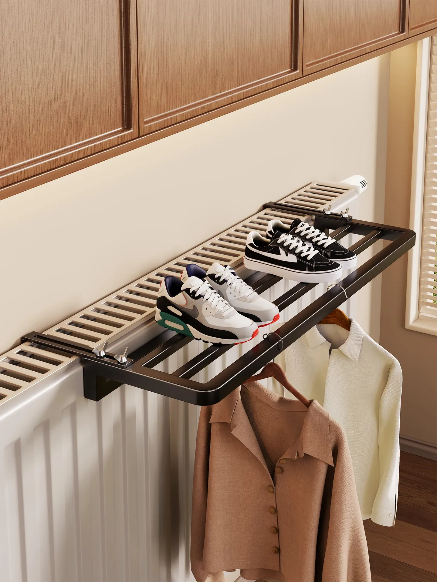 暖房用収納ラック!暖房パイプの上に置ける便利な衣類乾燥・靴干しスタンド。家の中でスペースを有効活用し、すっきりとした空間を実現!