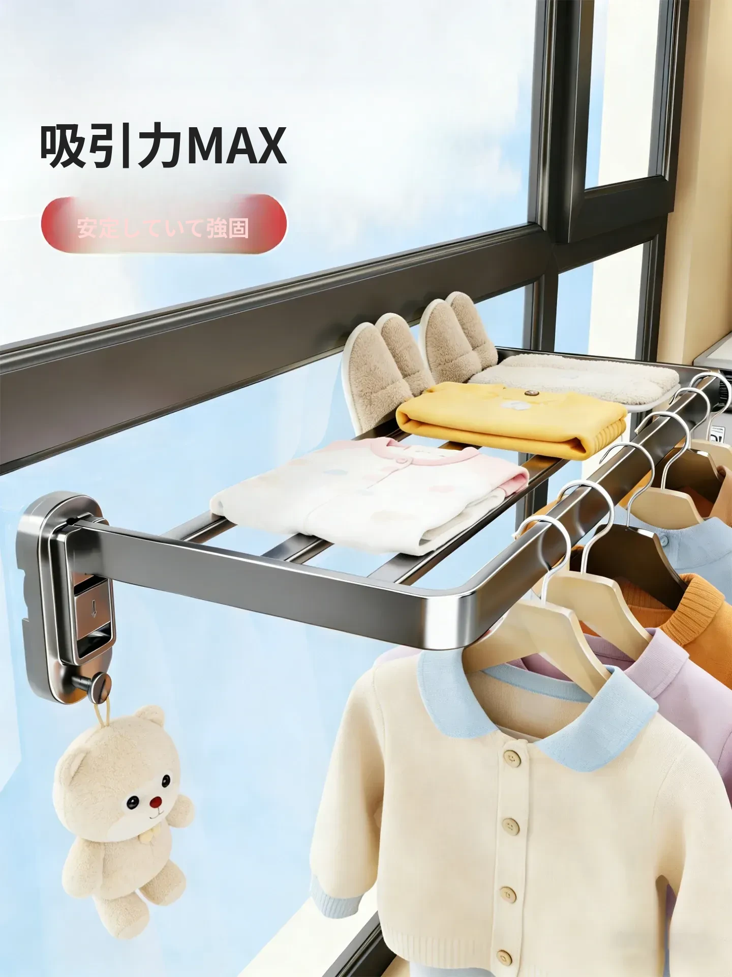 吸盤式バルコニー用衣類干しラック - 穴あけ不要のコンパクトサイズ!大容量で多機能、窓用の干し神器でお洗濯も楽々。おしゃれな空間を演出し、効率的に衣類を乾かしましょう!