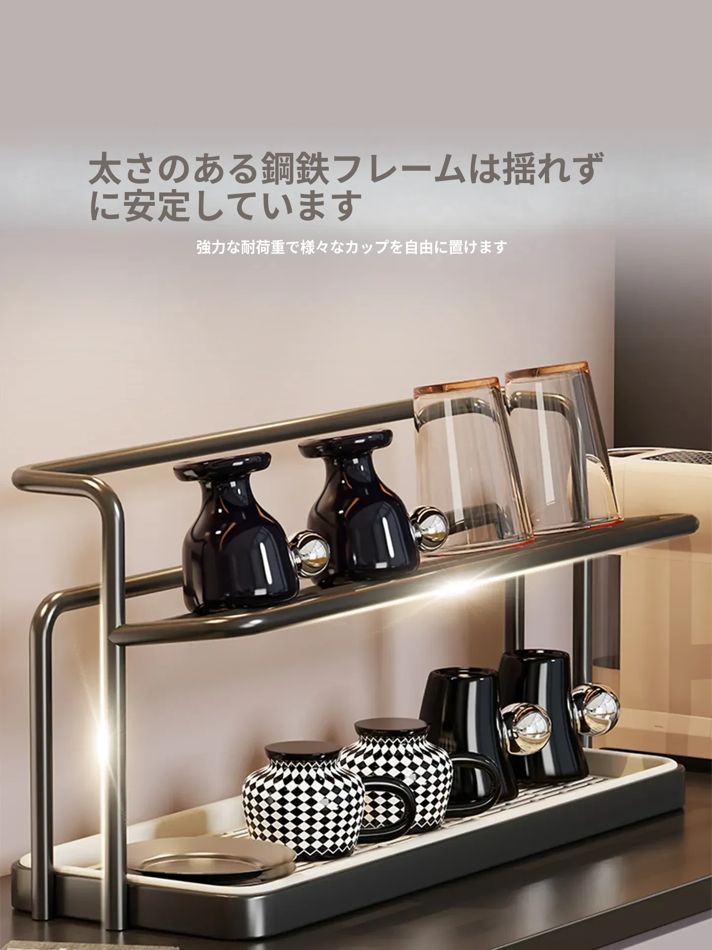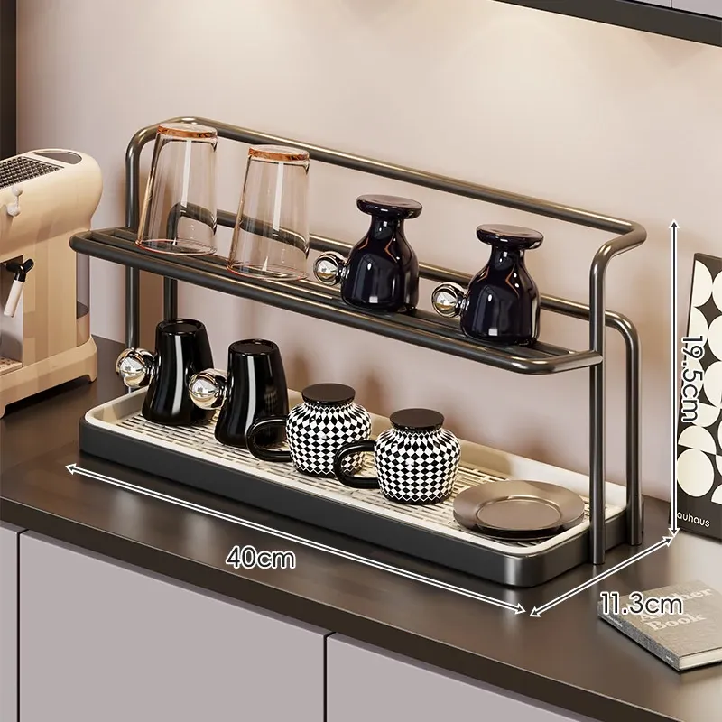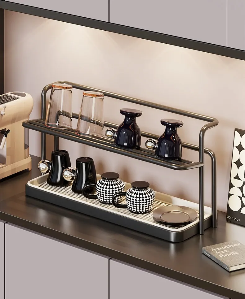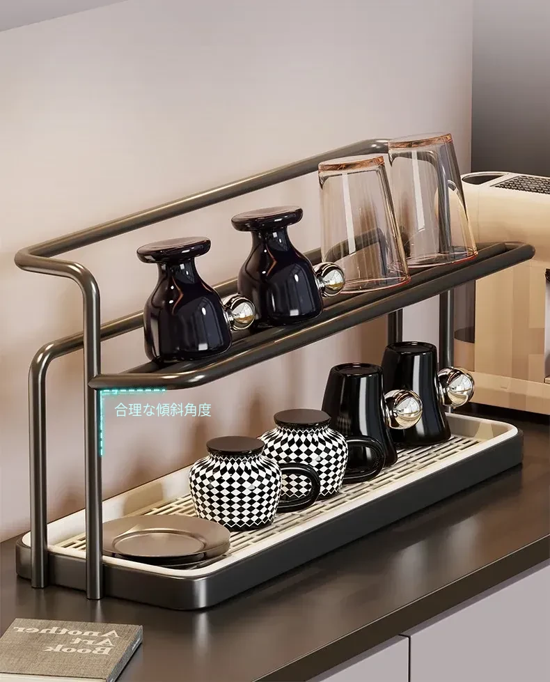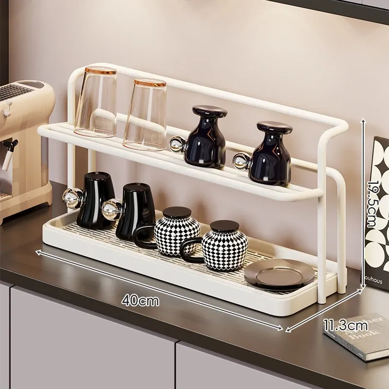 2段階のカップスタンド - テーブル用カップ水切りラック、ティーカップ&食器収納に最適なキッチン&ダイニング用サイドキャビネットラック!スッキリとしたデザインで、キッチンを美しく整理整頓!