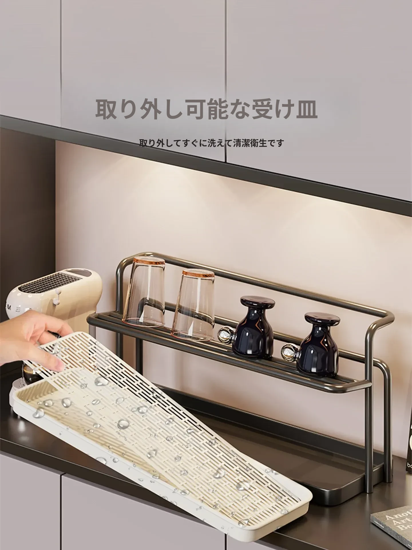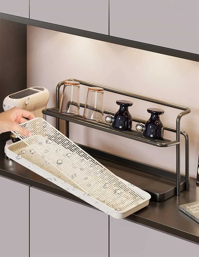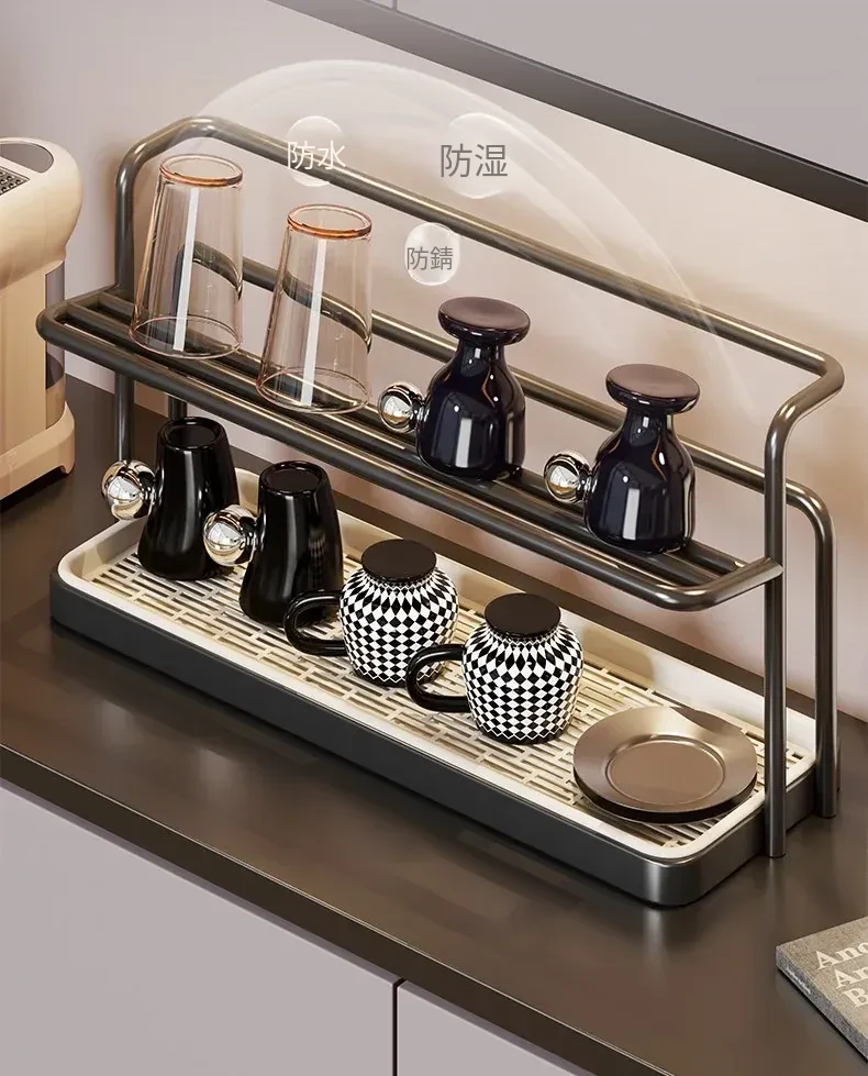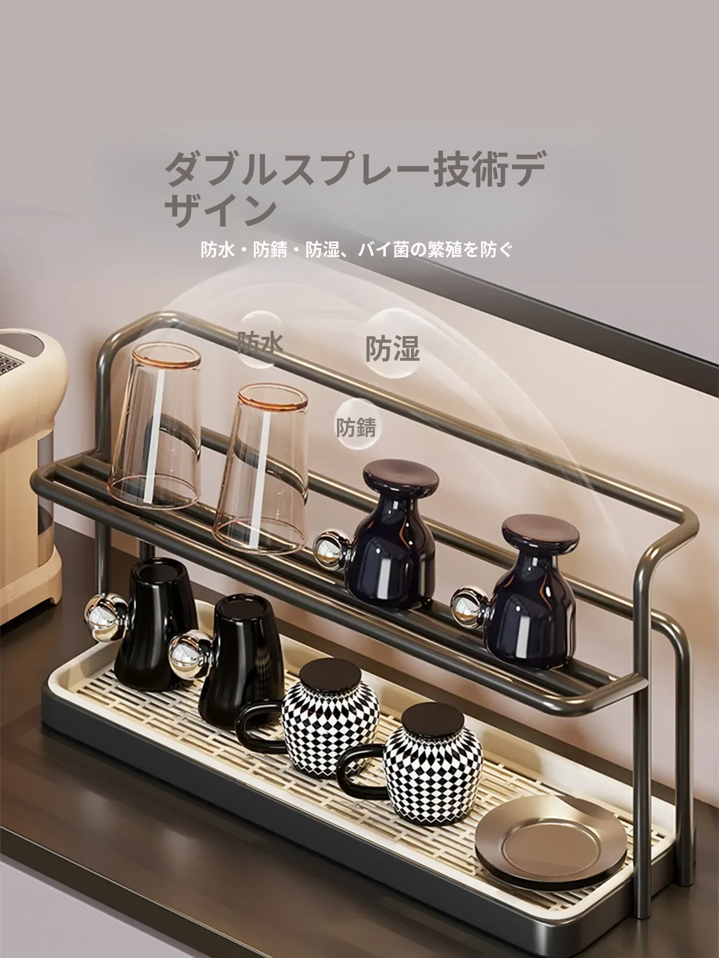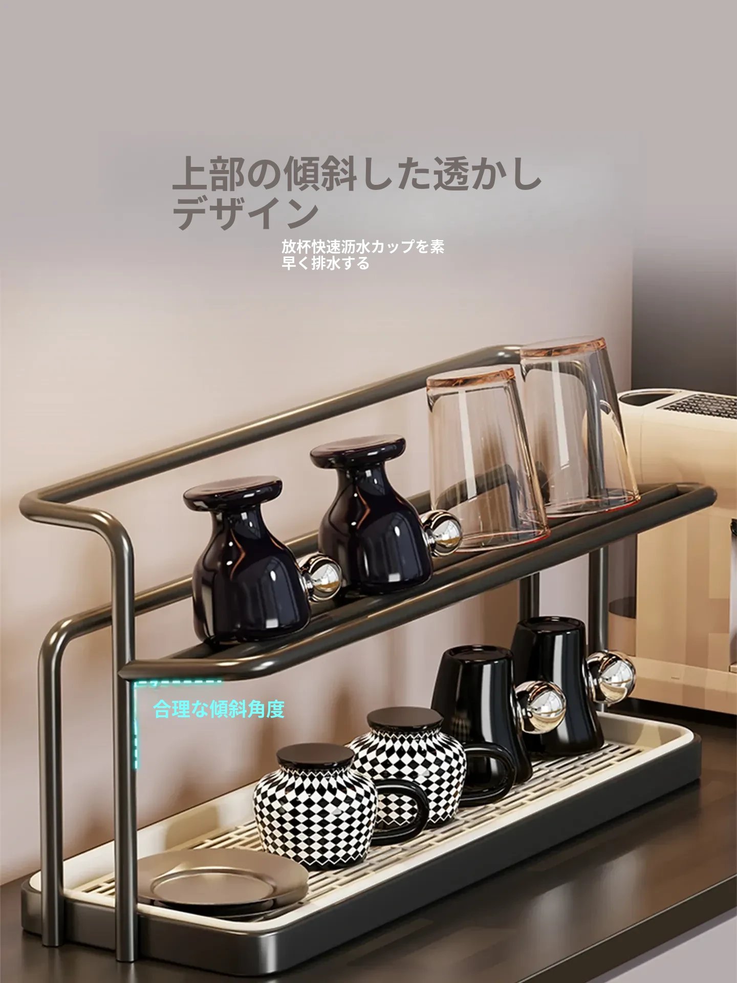 2段階のカップスタンド - テーブル用カップ水切りラック、ティーカップ&食器収納に最適なキッチン&ダイニング用サイドキャビネットラック!スッキリとしたデザインで、キッチンを美しく整理整頓!