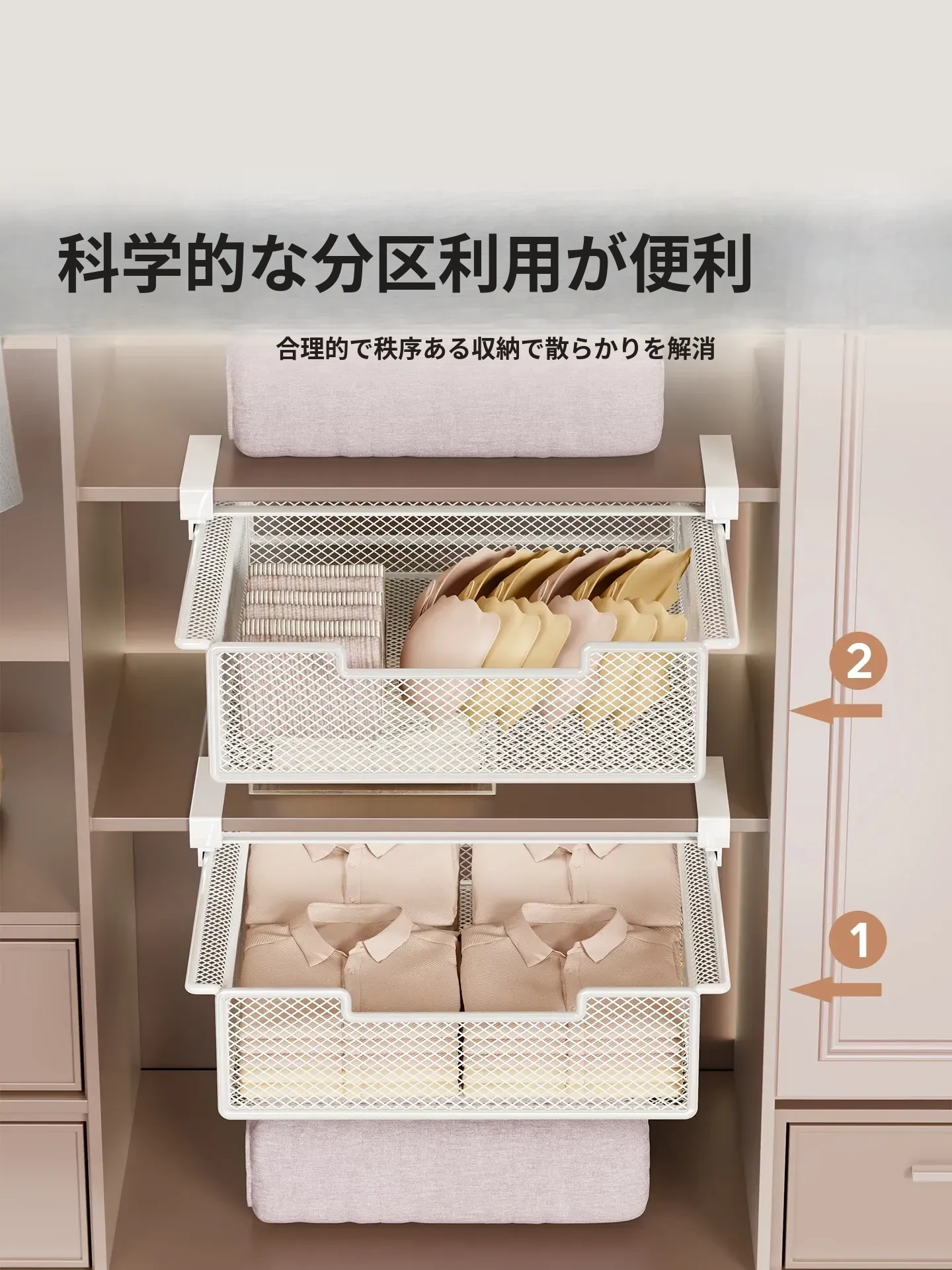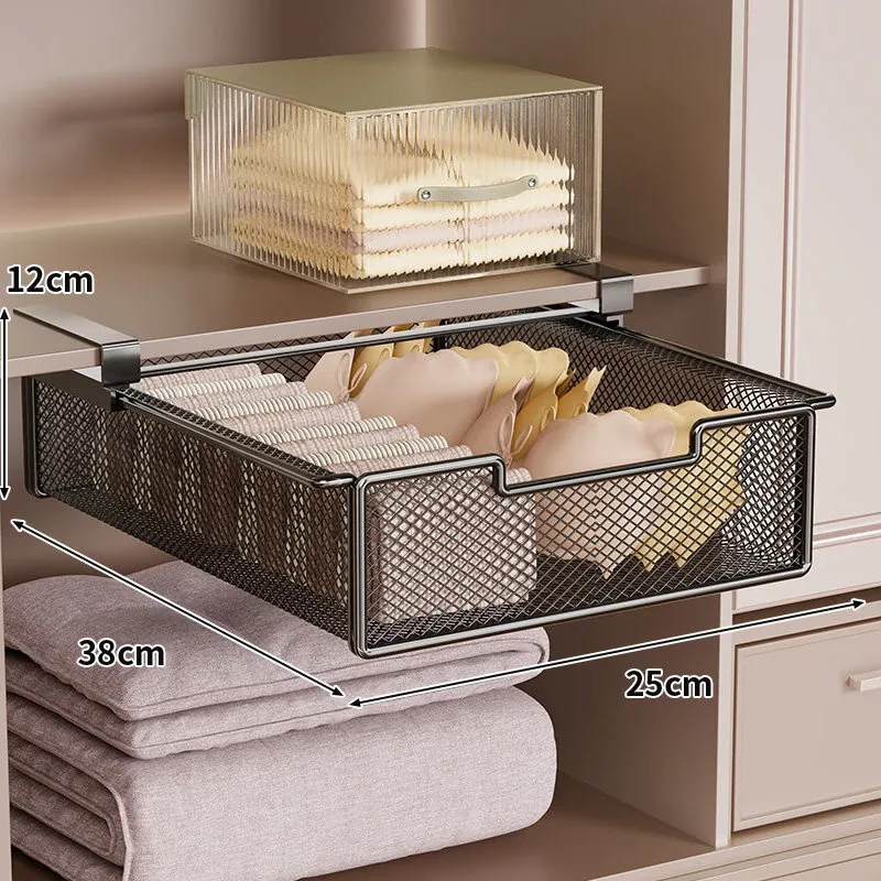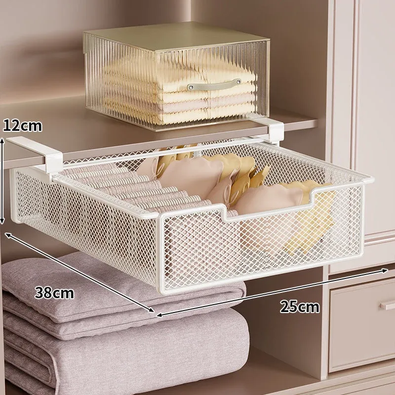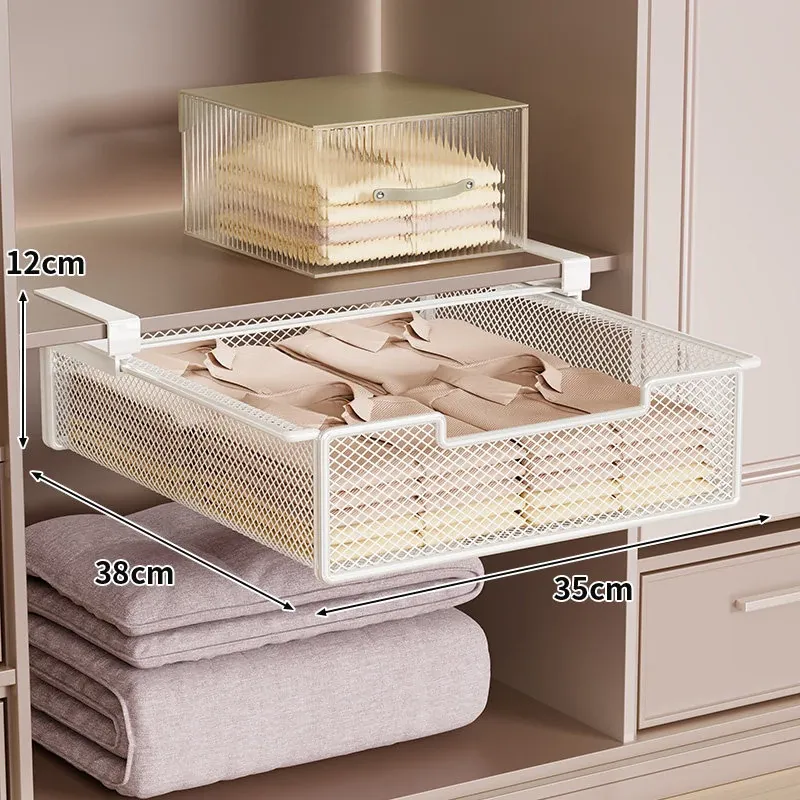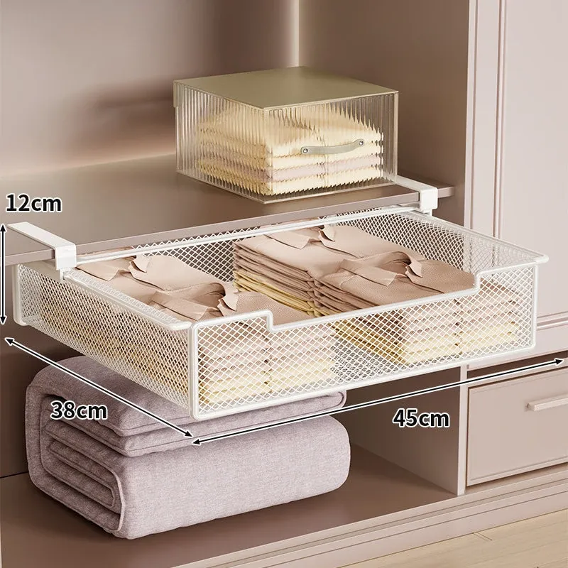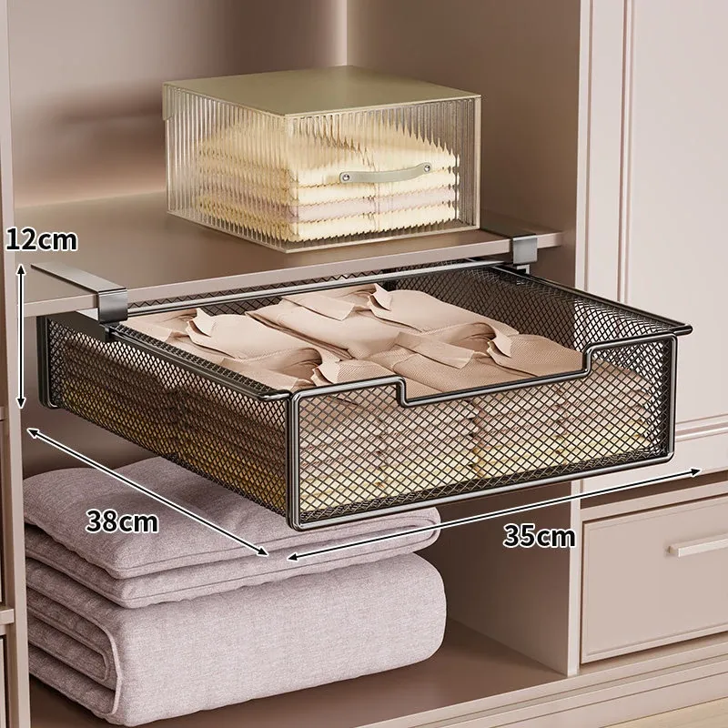 吊り下げ式クローゼット内蔵棚!衣類収納の救世主!穴あけ不要のスライド式衣類ハンガー&下掛けバスケットで、スッキリ整理整頓!あなたのクローゼットをもっと便利に!