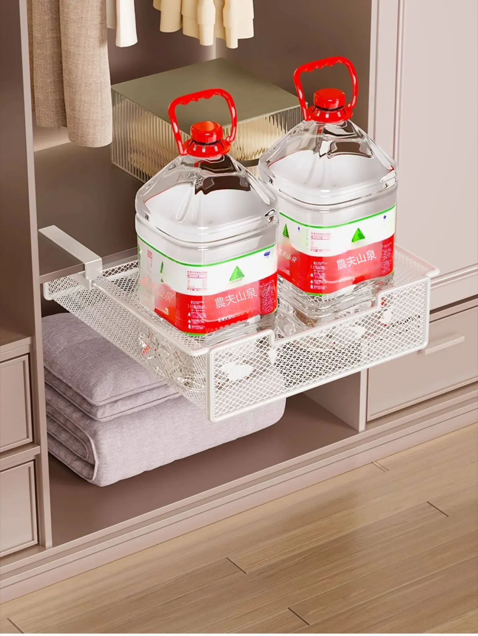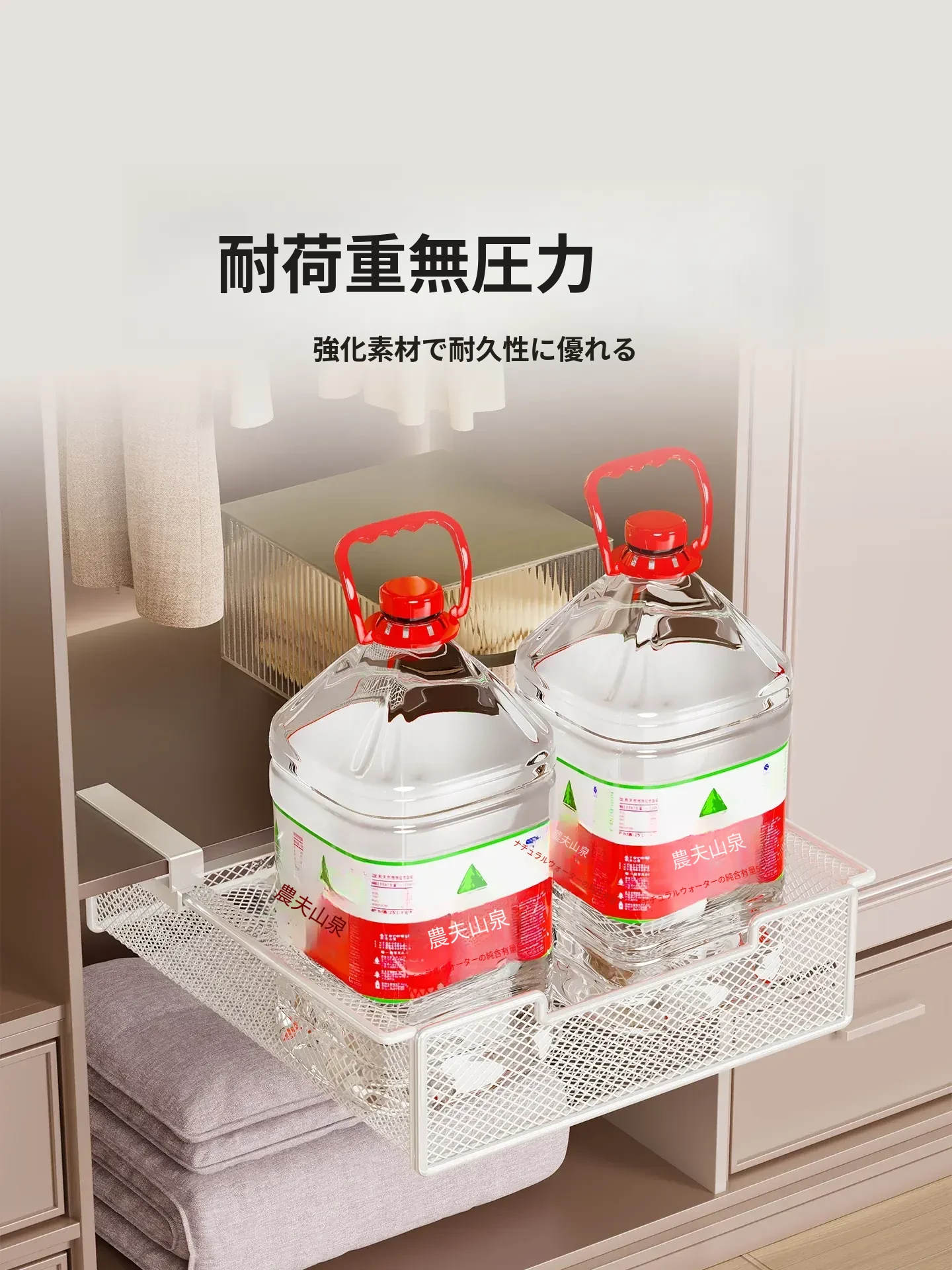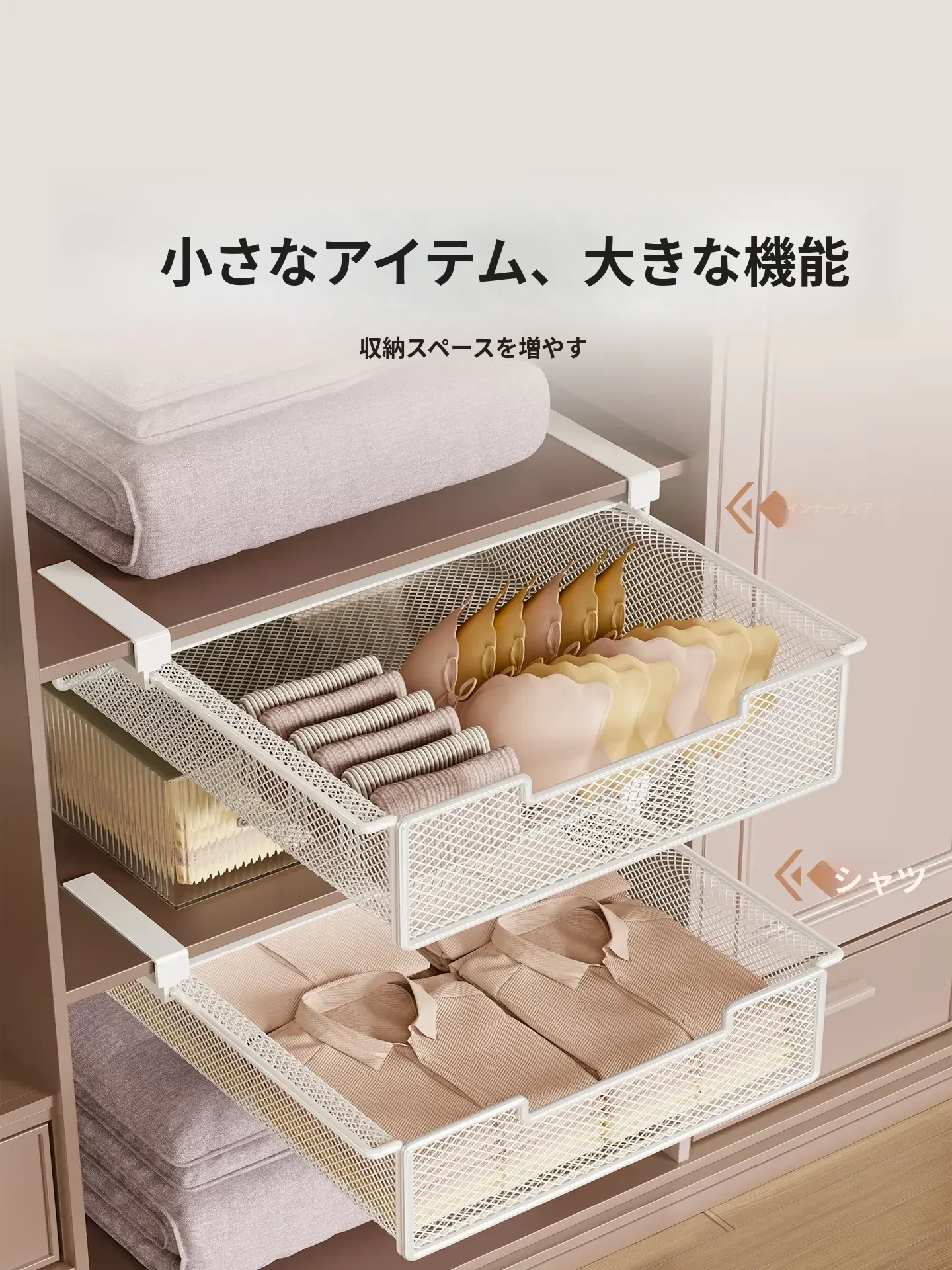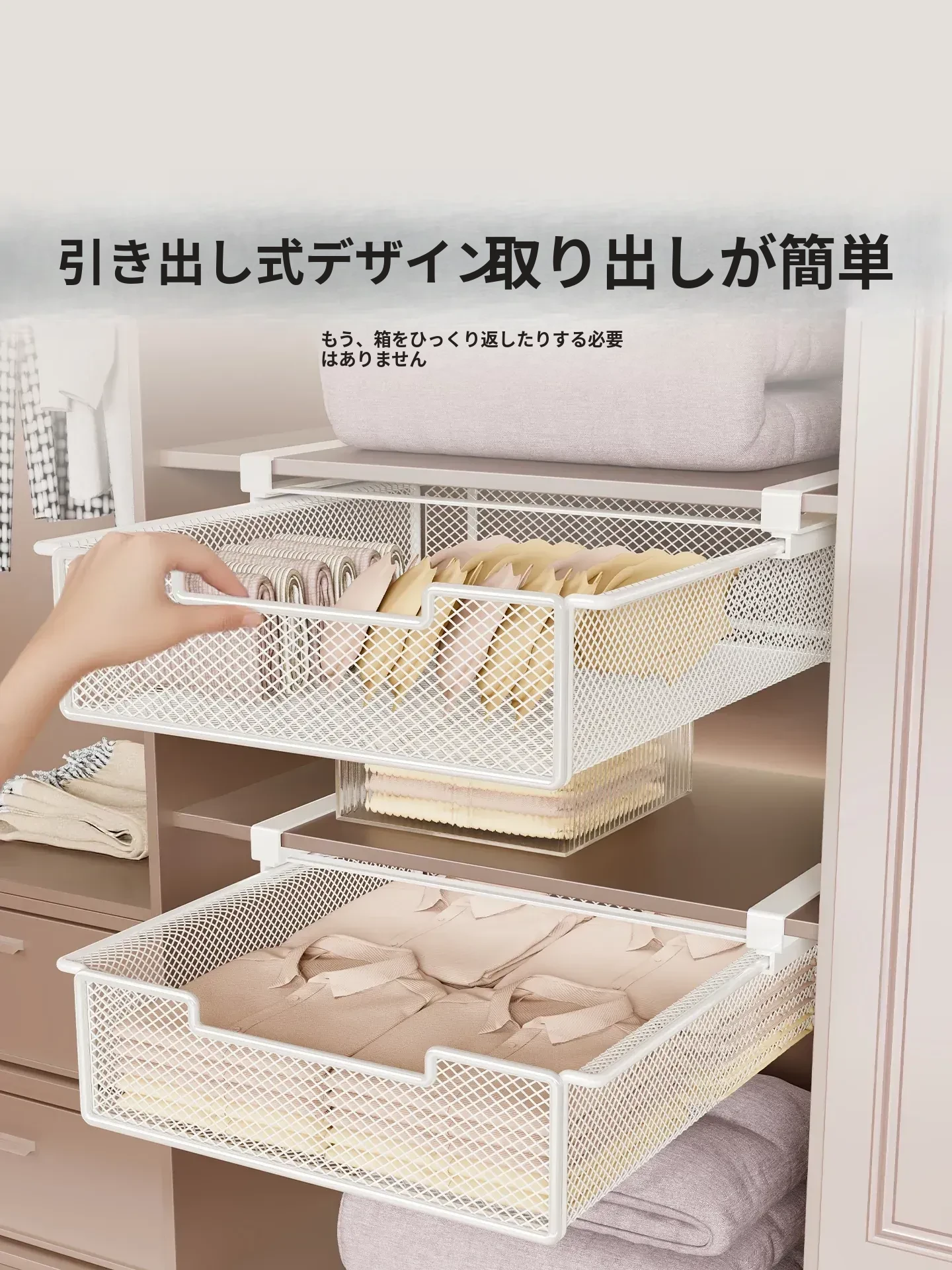 吊り下げ式クローゼット内蔵棚!衣類収納の救世主!穴あけ不要のスライド式衣類ハンガー&下掛けバスケットで、スッキリ整理整頓!あなたのクローゼットをもっと便利に!