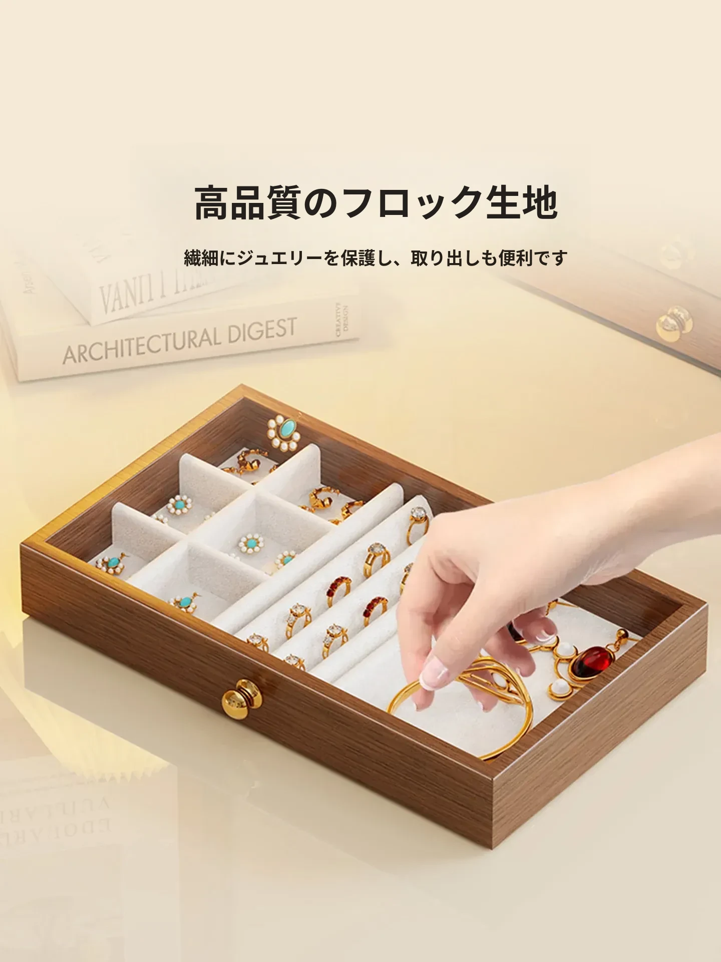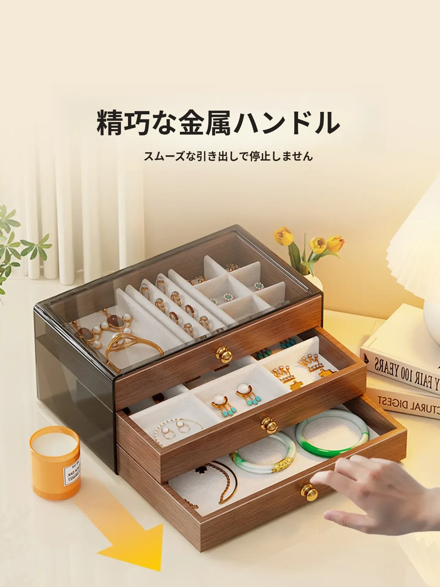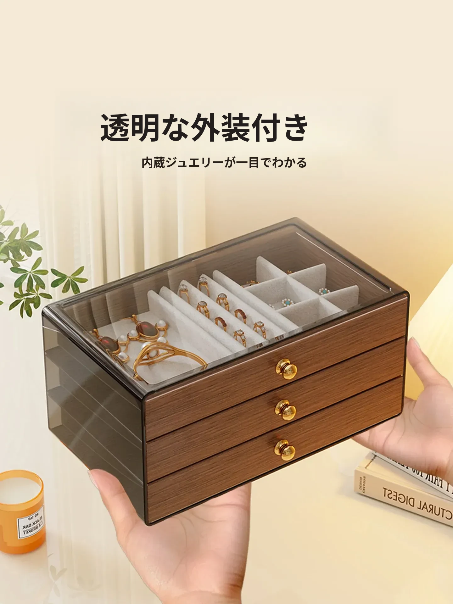 多層デザインのジュエリーボックス - デスク用、リング・ネックレス・イヤリングを美しく収納!高級感あふれる木製のディスプレイキャビネットで、あなたの大切なアクセサリーを魅力的に見せましょう!