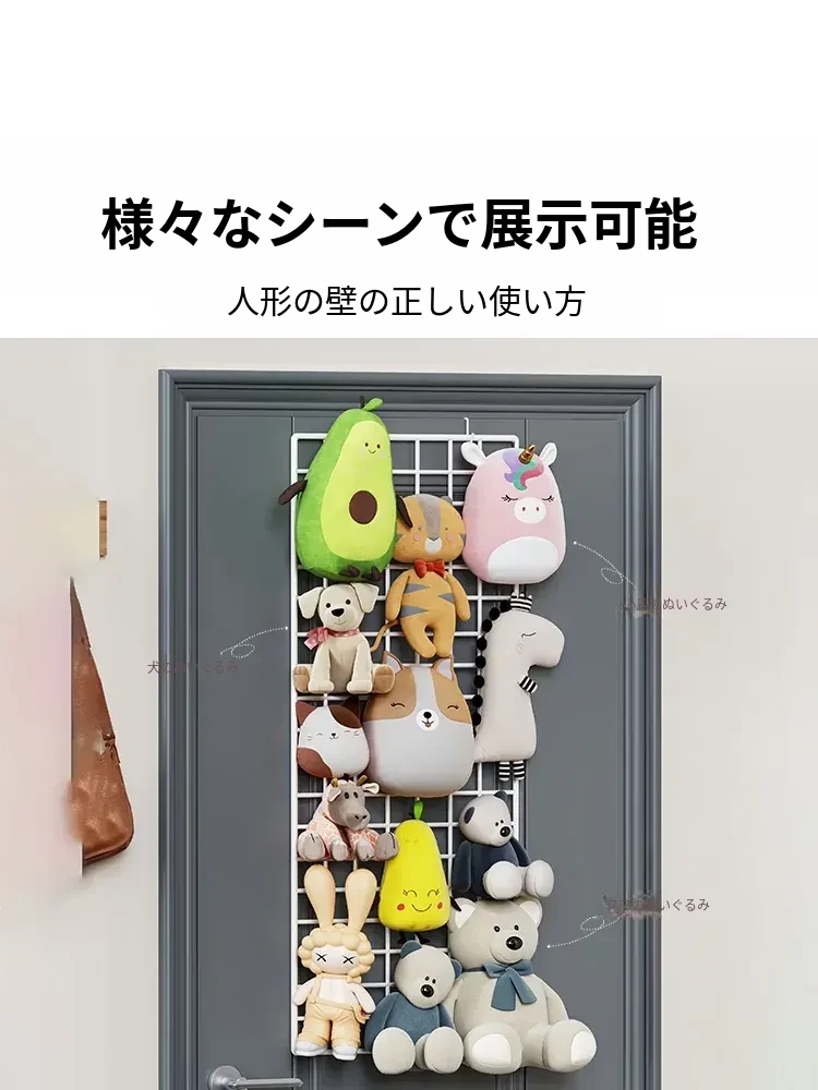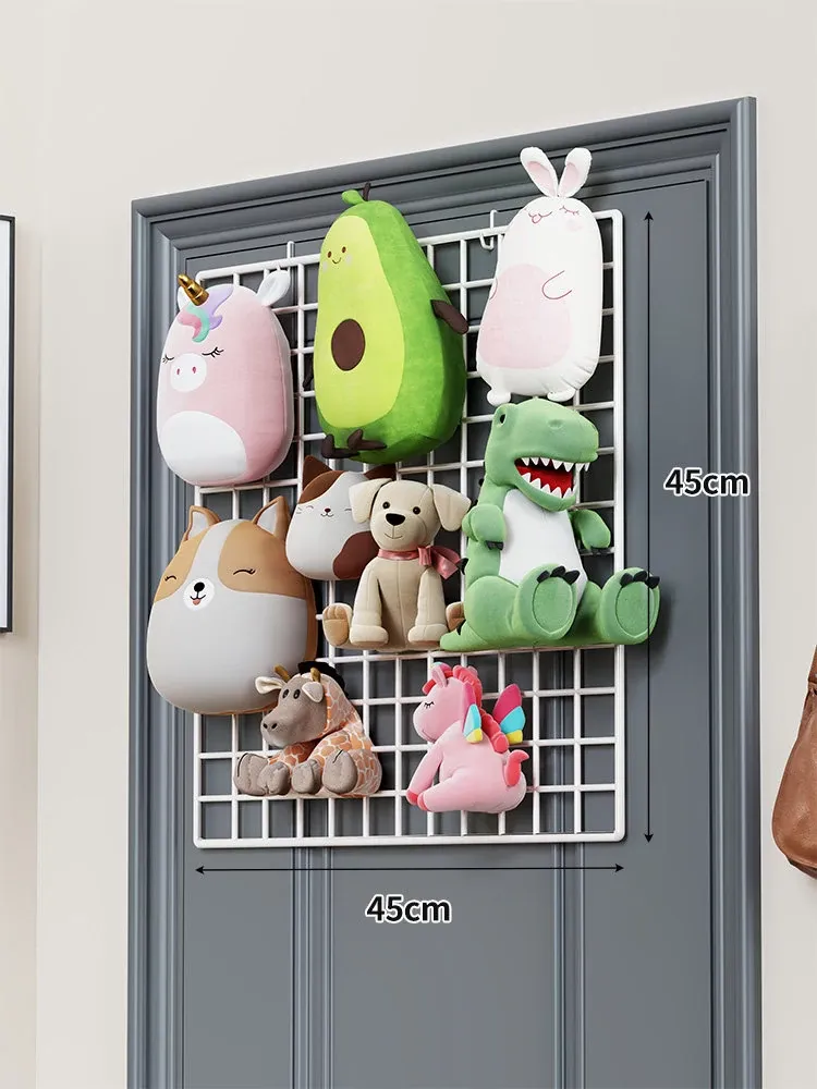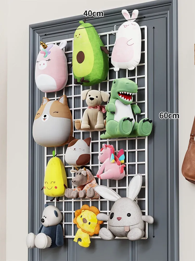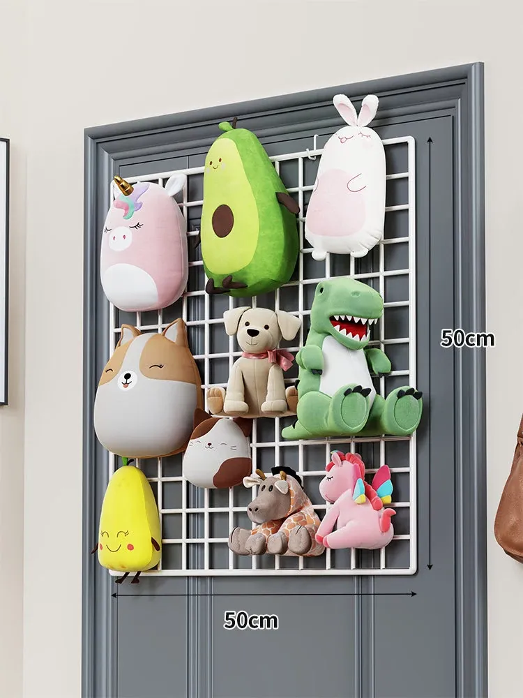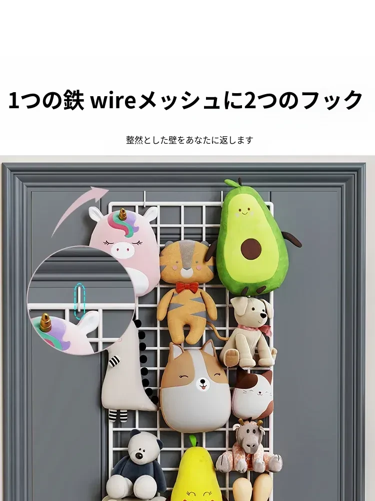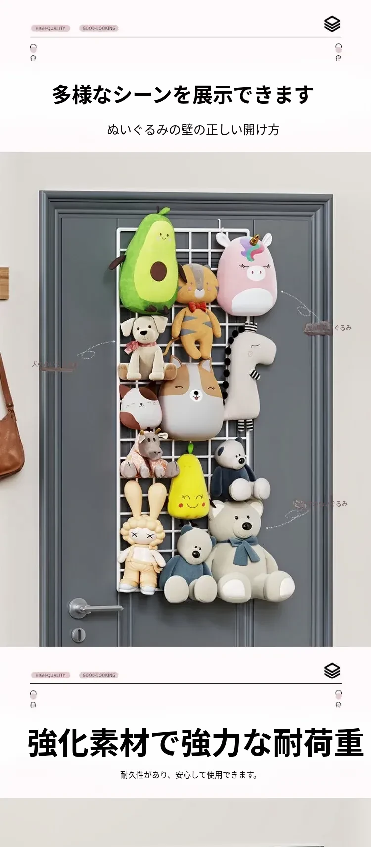 ぬいぐるみを美しく展示!ドアの後ろにぴったりフィットする収納ネット格子ラック。愛の壁を演出するための固定背景としても最適。お部屋を彩るかわいいディスプレイを実現しましょう!