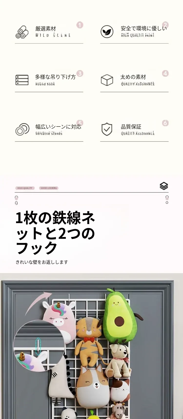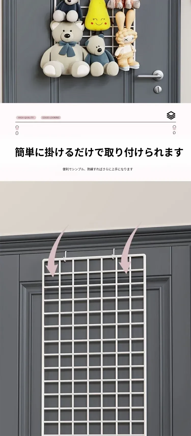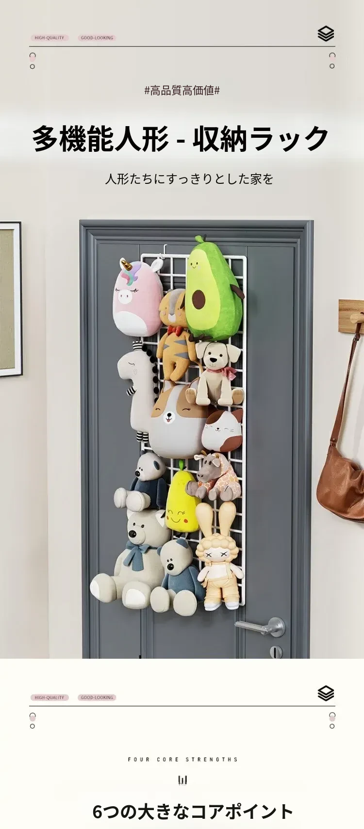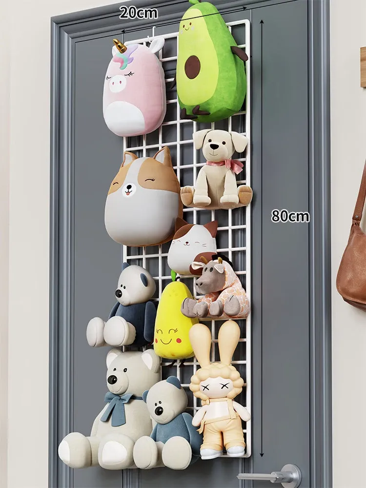 ぬいぐるみを美しく展示!ドアの後ろにぴったりフィットする収納ネット格子ラック。愛の壁を演出するための固定背景としても最適。お部屋を彩るかわいいディスプレイを実現しましょう!