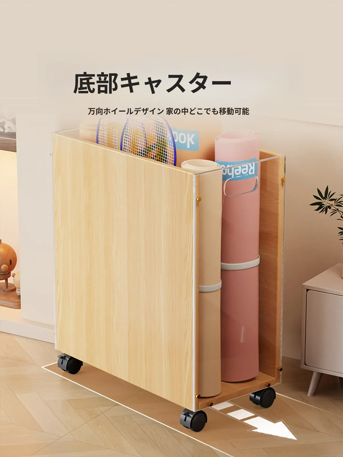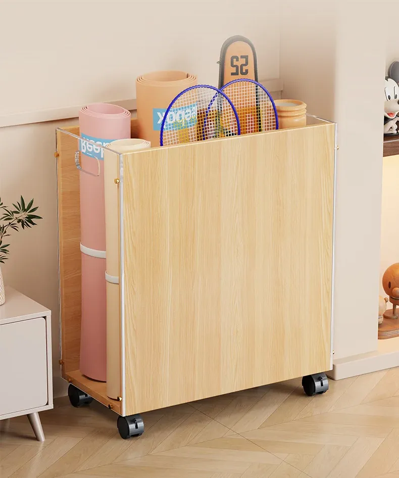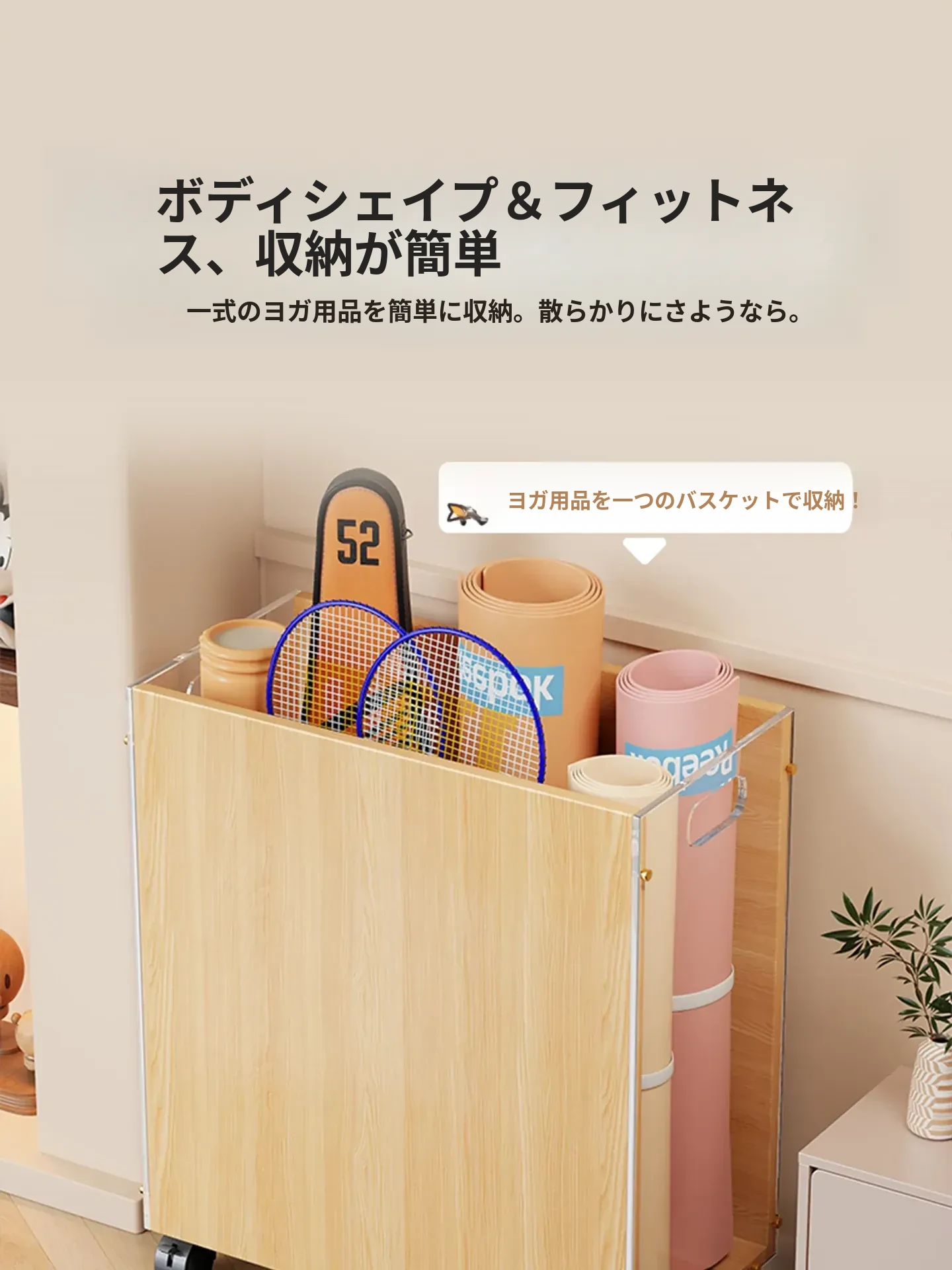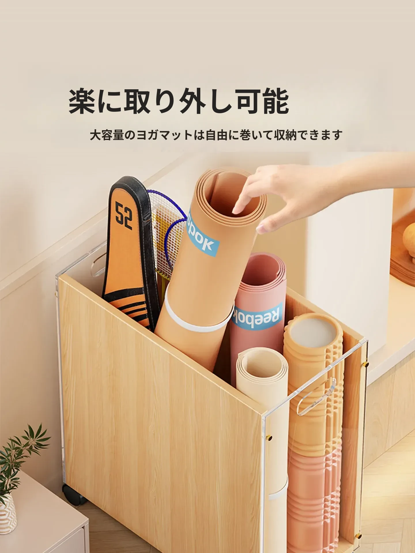 ヨガマット収納バスケット・キャスター付き!家庭用フィットネス器具の移動式収納ラック、スポーツツールやバスケットボールの置き場に最適!整理整頓で快適なトレーニング空間を実現!