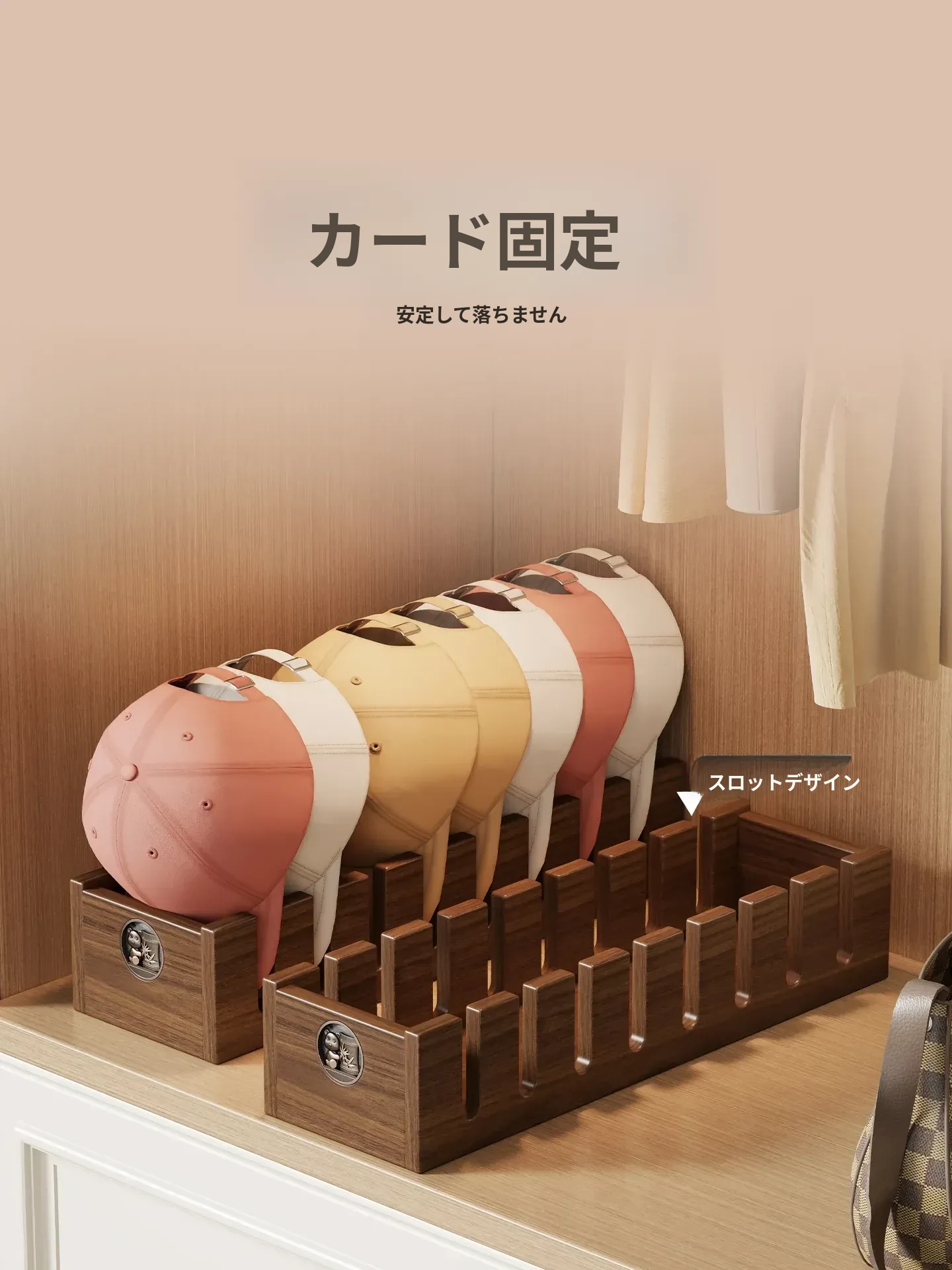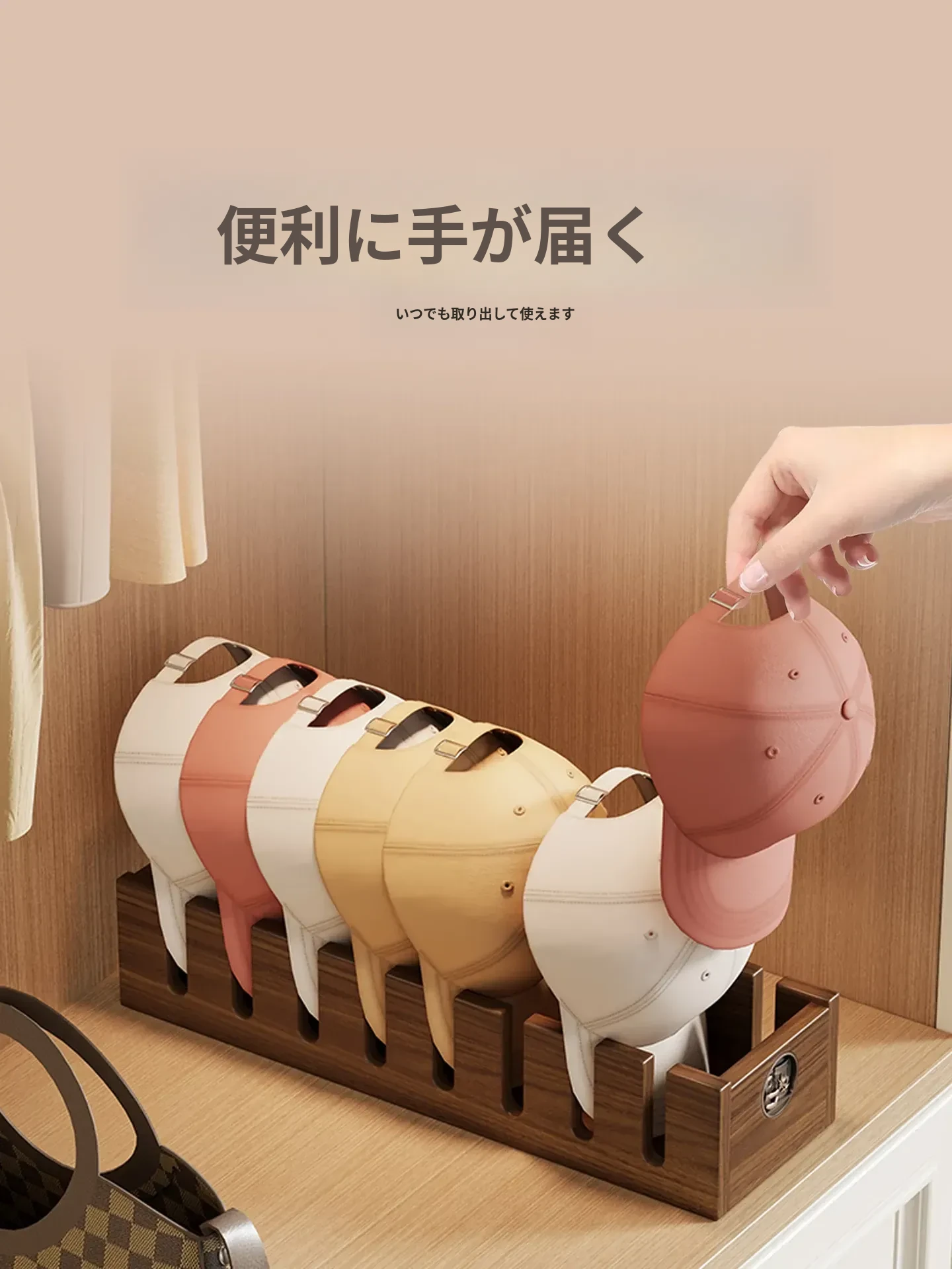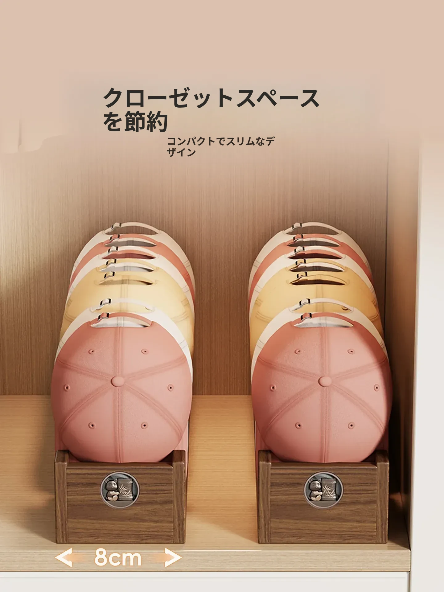 実木製の帽子収納マジック!家庭用クローゼットや玄関に最適なテニスキャップの階層収納、スナップバックやベースボールキャップのディスプレイラック。おしゃれに整理整頓して、スペースを有効活用!