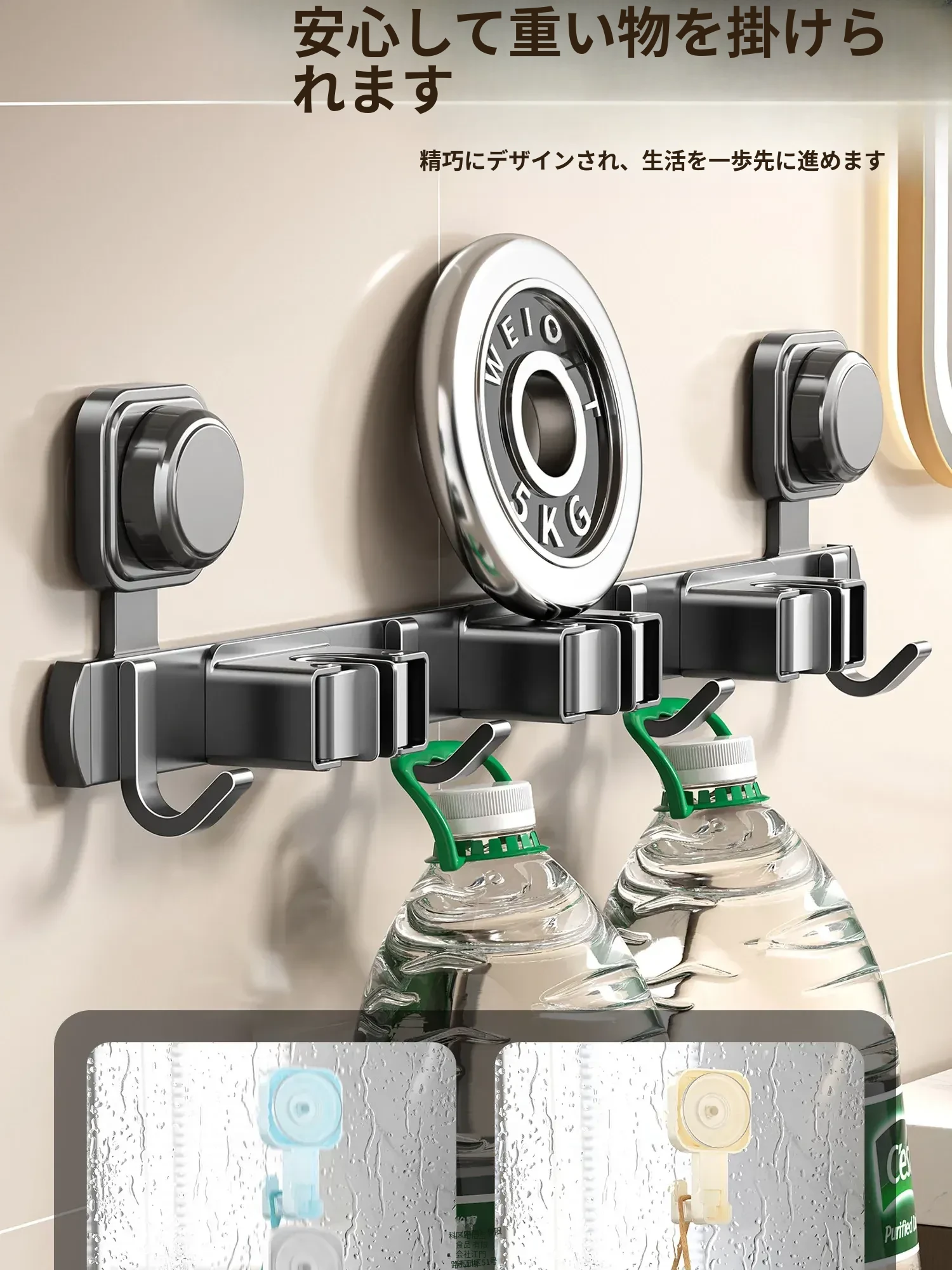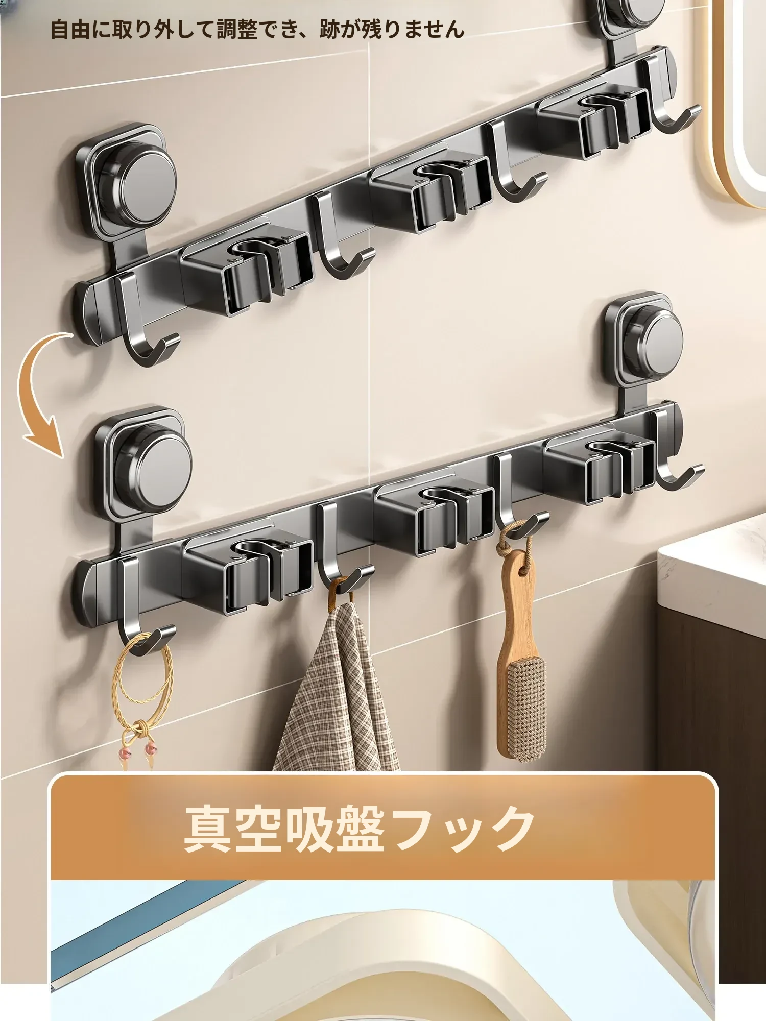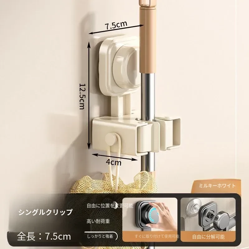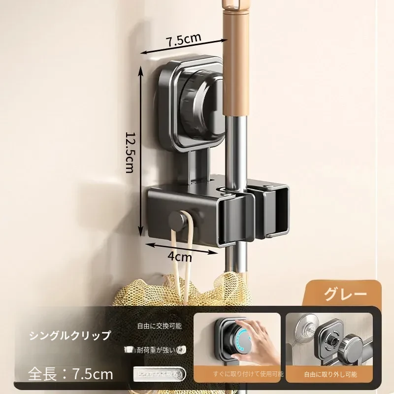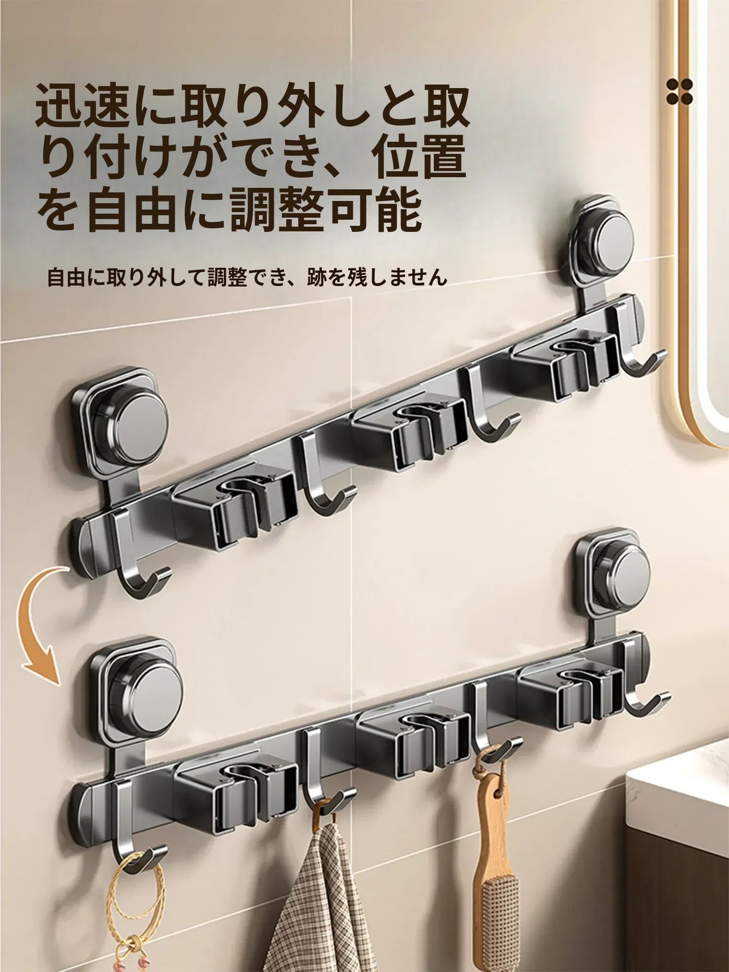 壁掛けモップクリップ 強力吸盤フック 取付不要の便利グッズ!トイレ掃除やバルコニーの衣類掛けに最適な掃除道具固定アイテム!