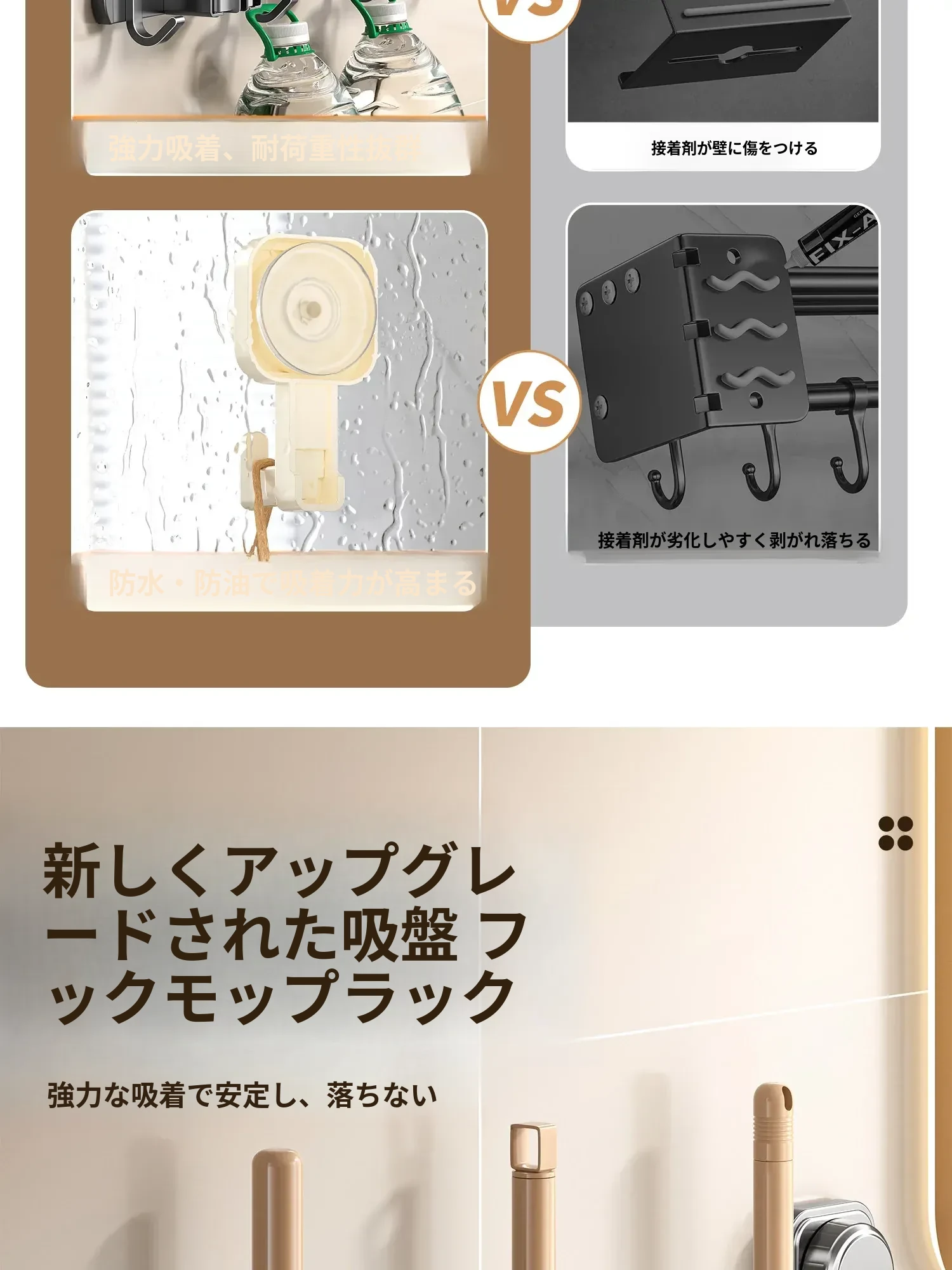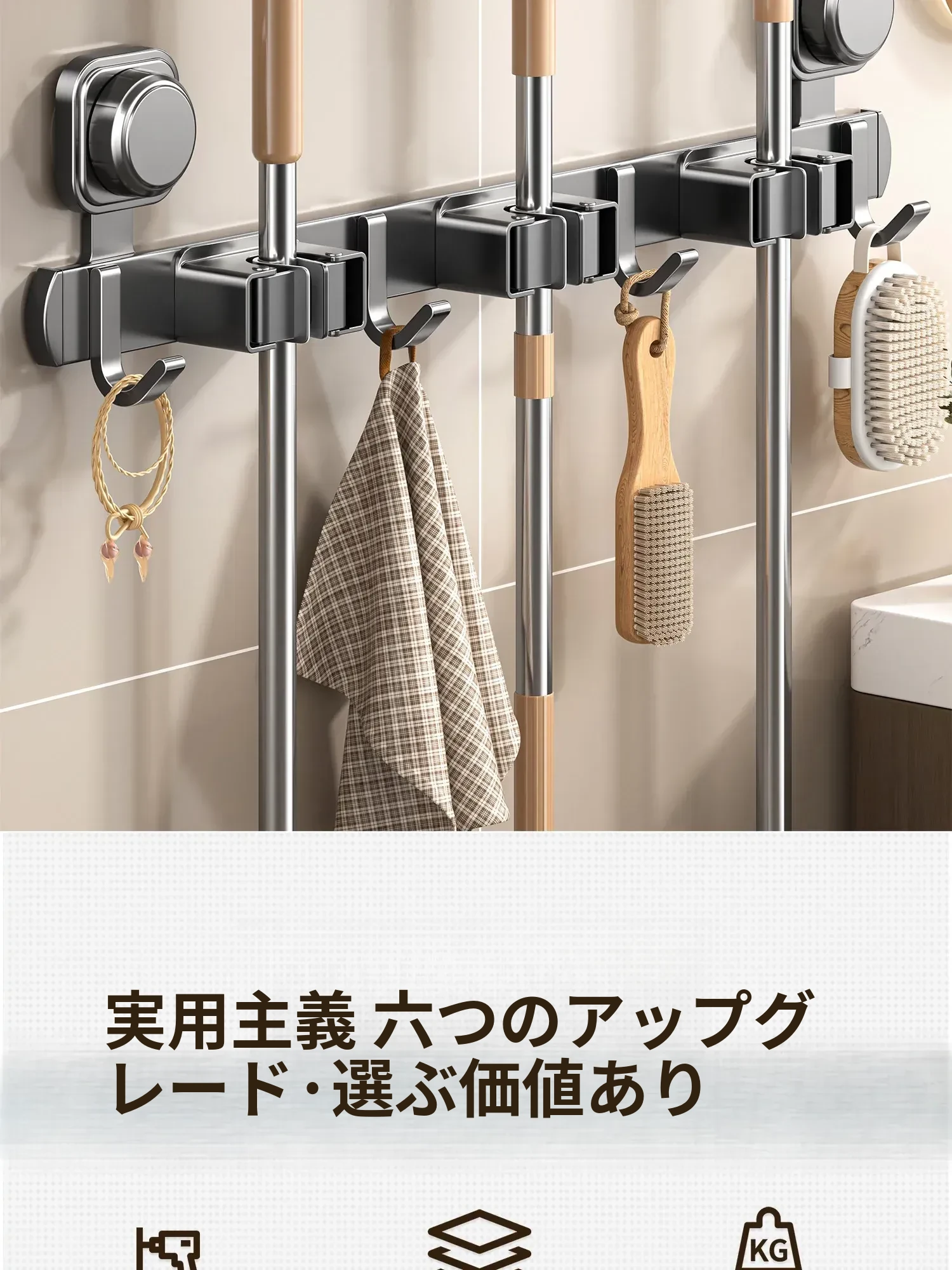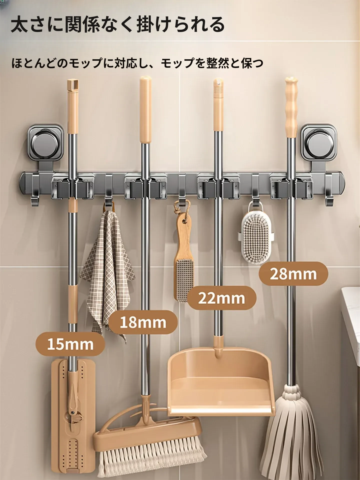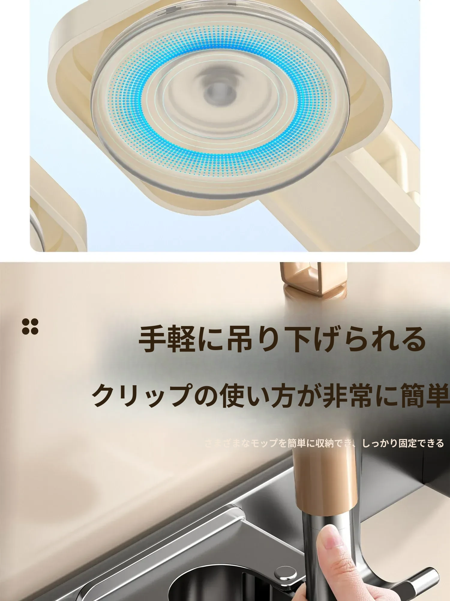 壁掛けモップクリップ 強力吸盤フック 取付不要の便利グッズ!トイレ掃除やバルコニーの衣類掛けに最適な掃除道具固定アイテム!