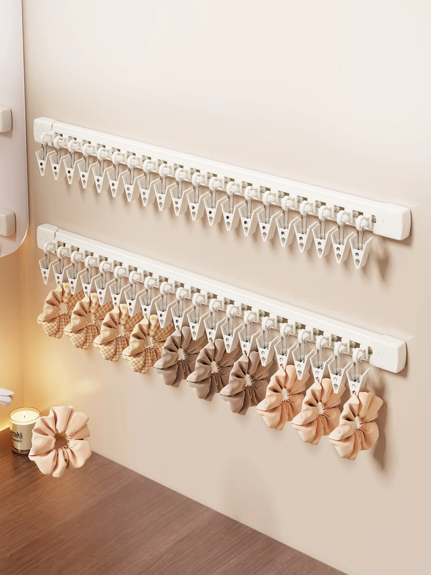 壁掛け式ヘアアクセサリー収納ラック - 大容量で便利なヘアゴムディスプレイ!穴を開けずに簡単取り付け、スライド式のヘアゴムクリップでおしゃれに整理整頓。あなたの髪飾りを美しく見せる新しいスタイル!