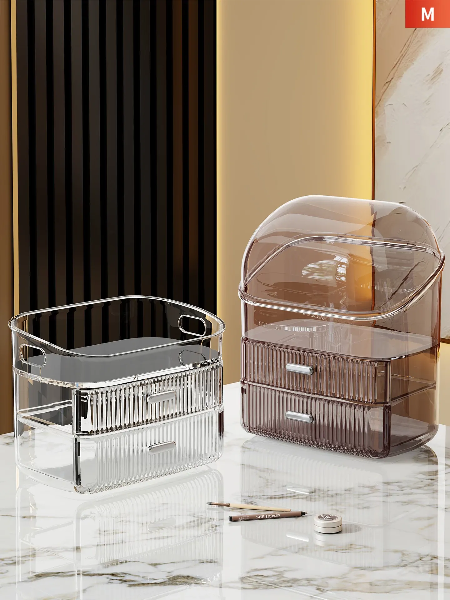 高級感漂う透明デザインのデスク用化粧品収納ボックス!埃を防ぐ蓋付きで、香水やスキンケアアイテムを美しく整理。多層収納で使い勝手抜群、あなたのコスメをスタイリッシュに演出します!